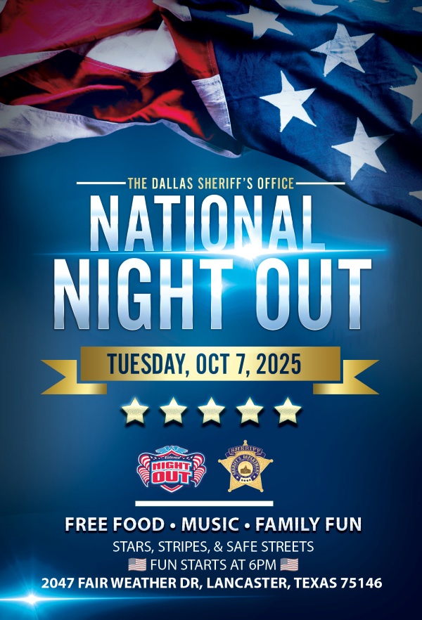 We are excited to invite you and your family to our annual National Night Out Event, held in coordination with the Dallas Sheriff’s Office. The evening will feature free food, live music, and fun activities for the kids—so be sure to mark your calendars and join us for this special community event!